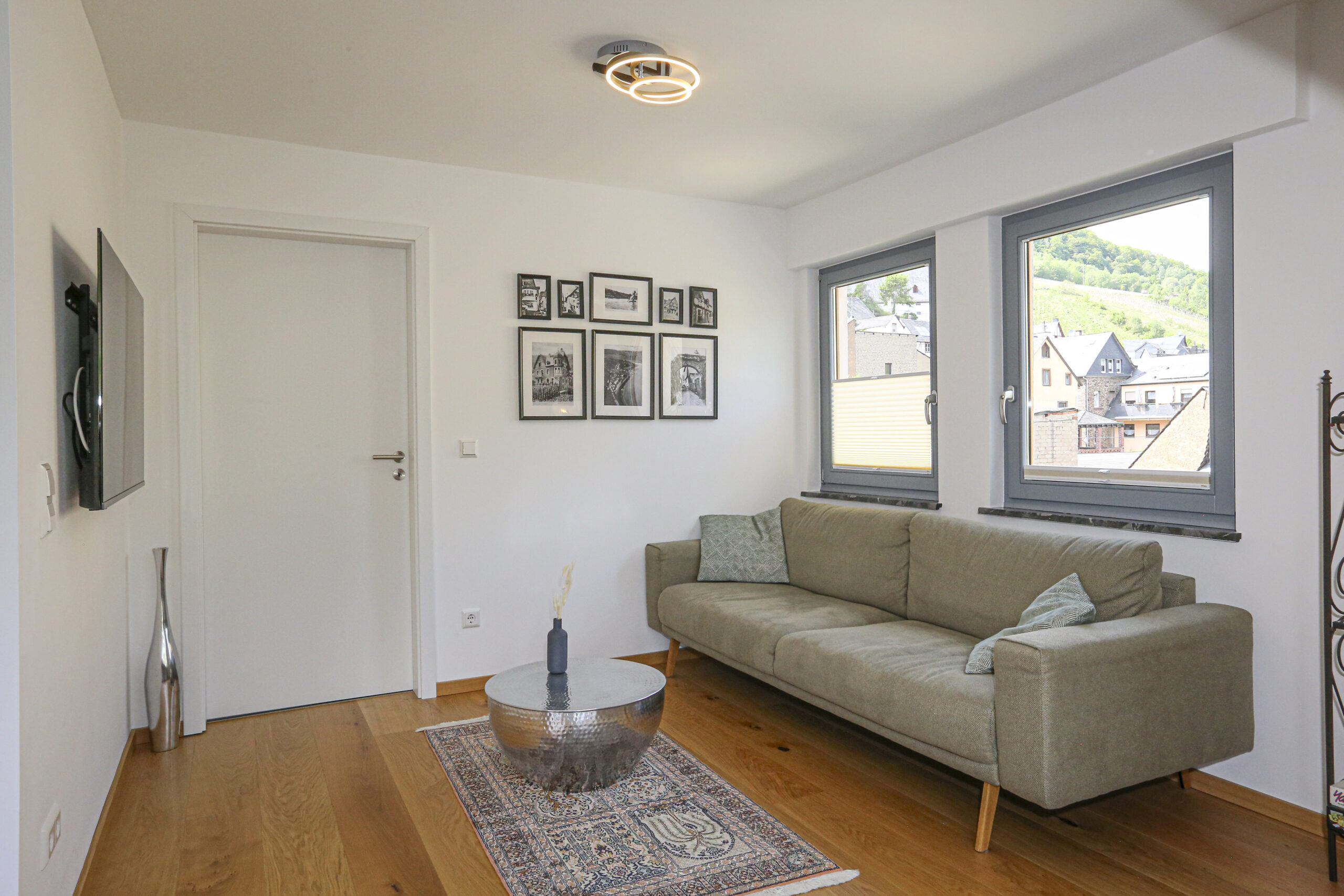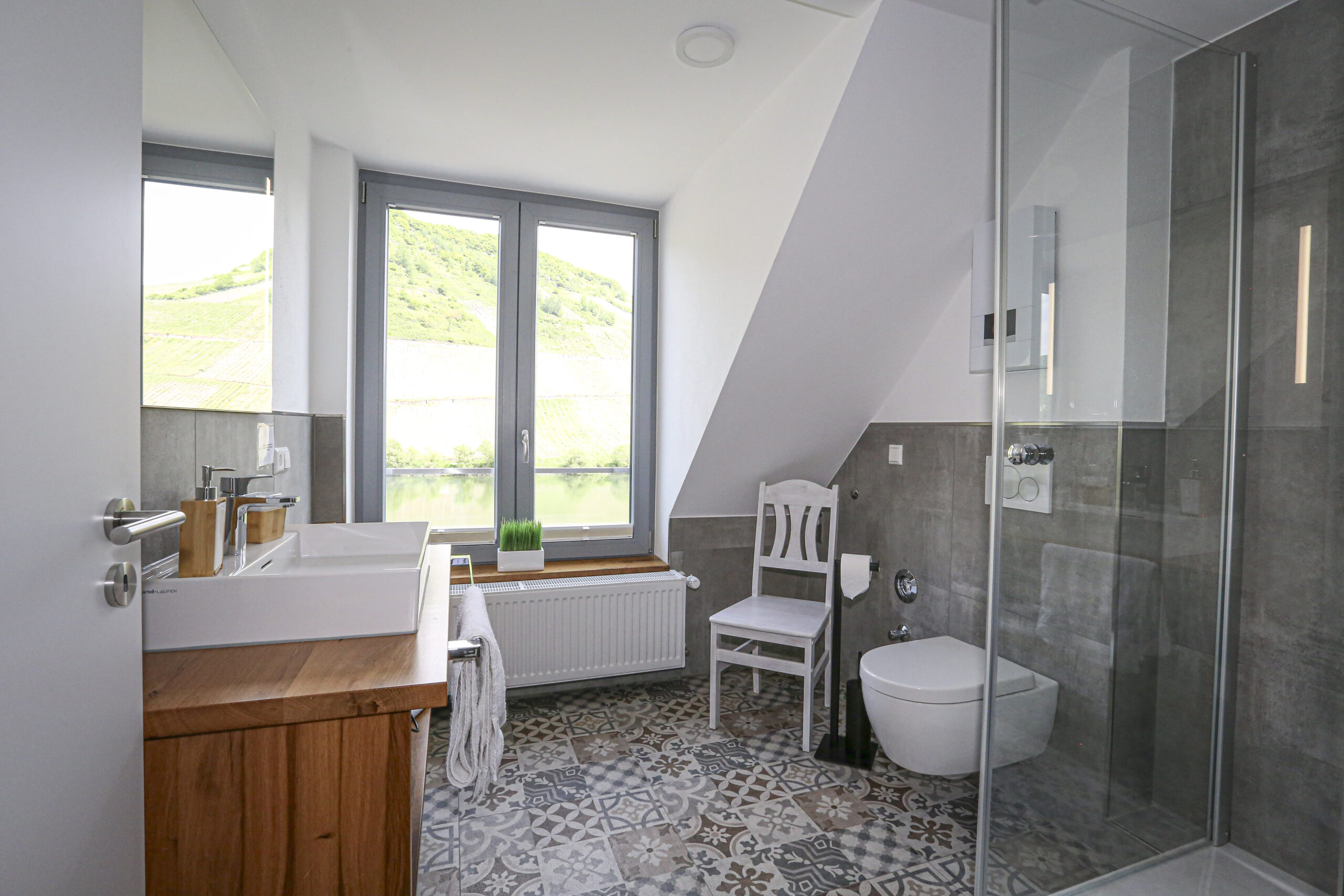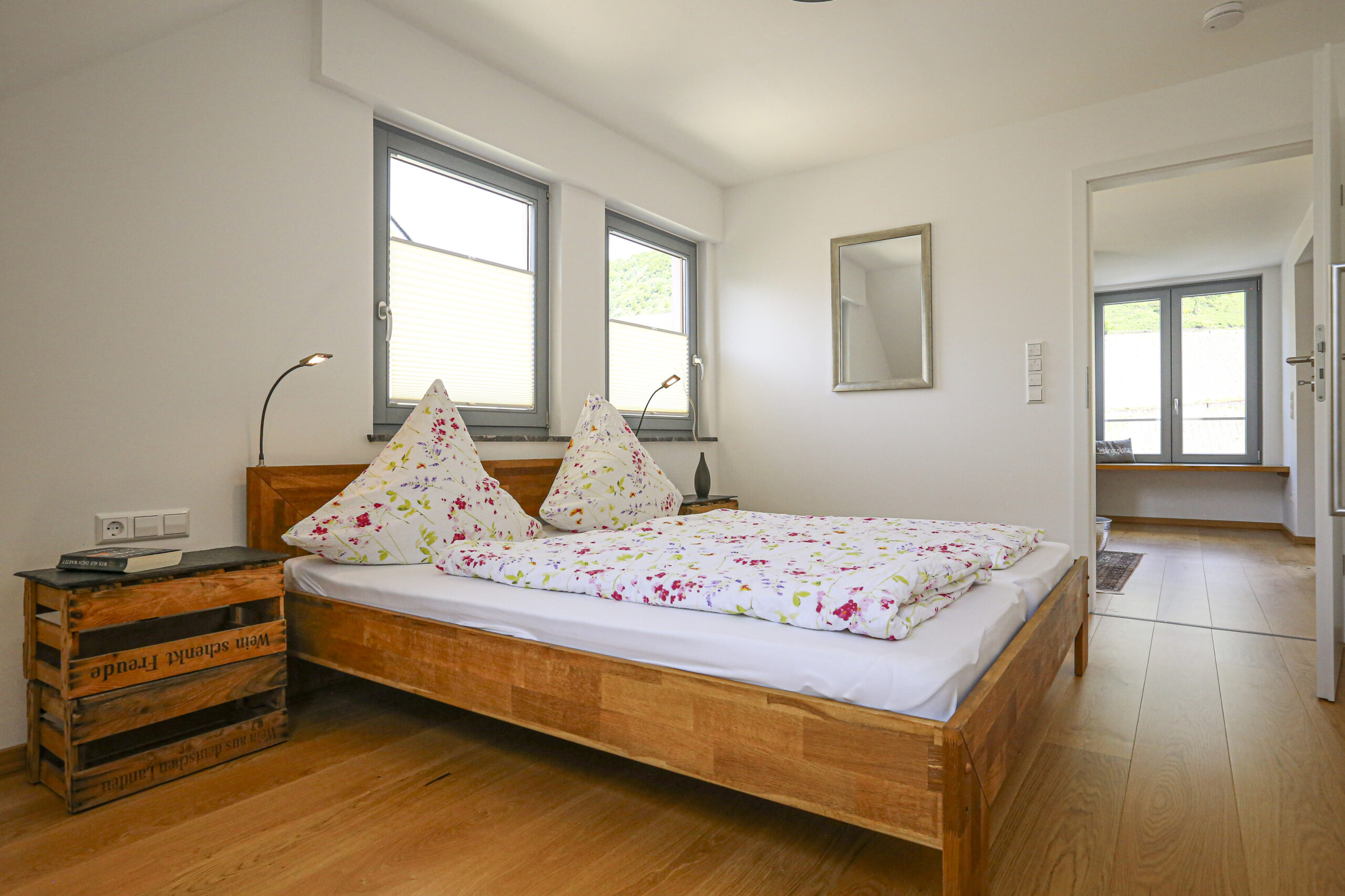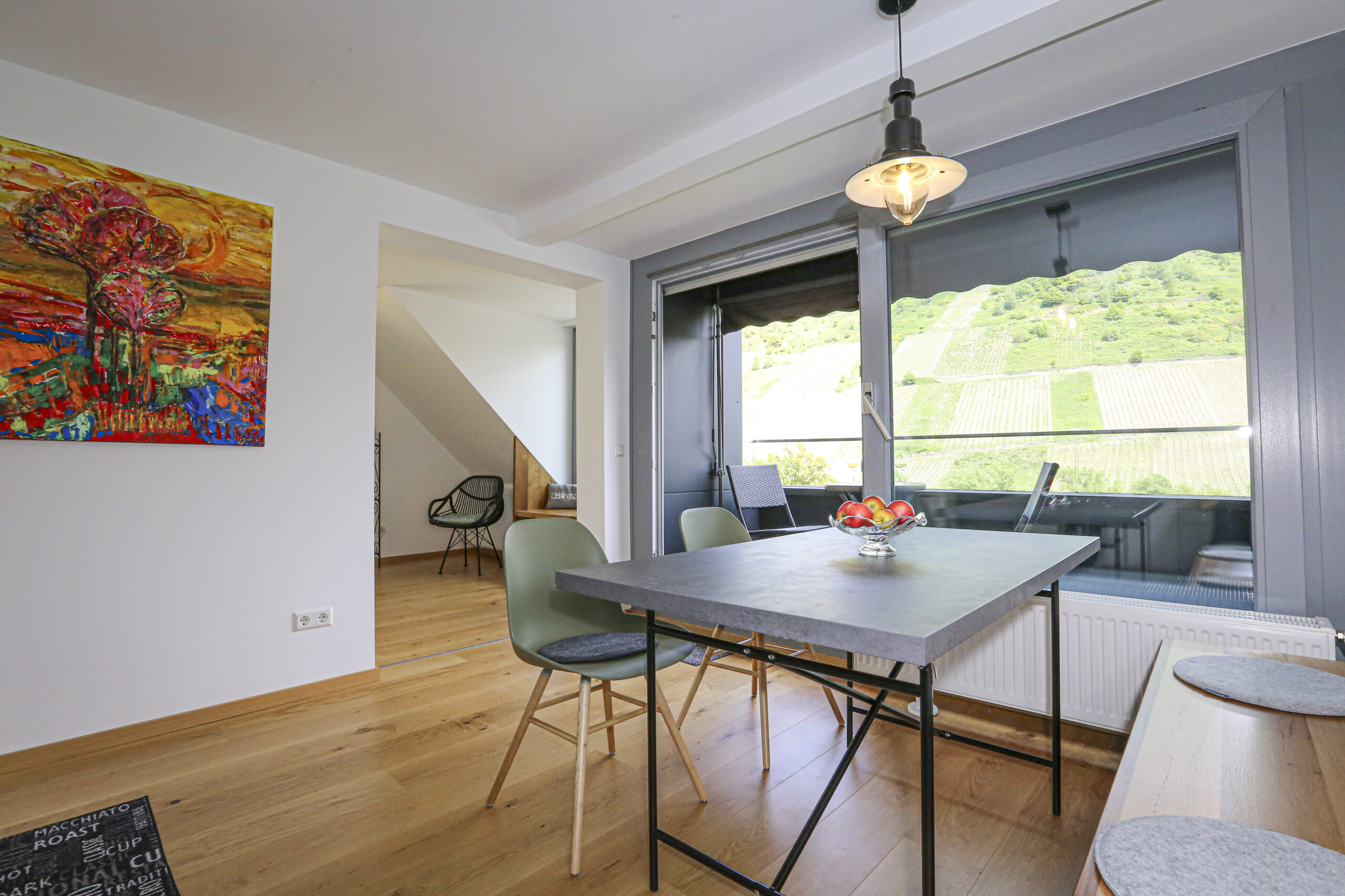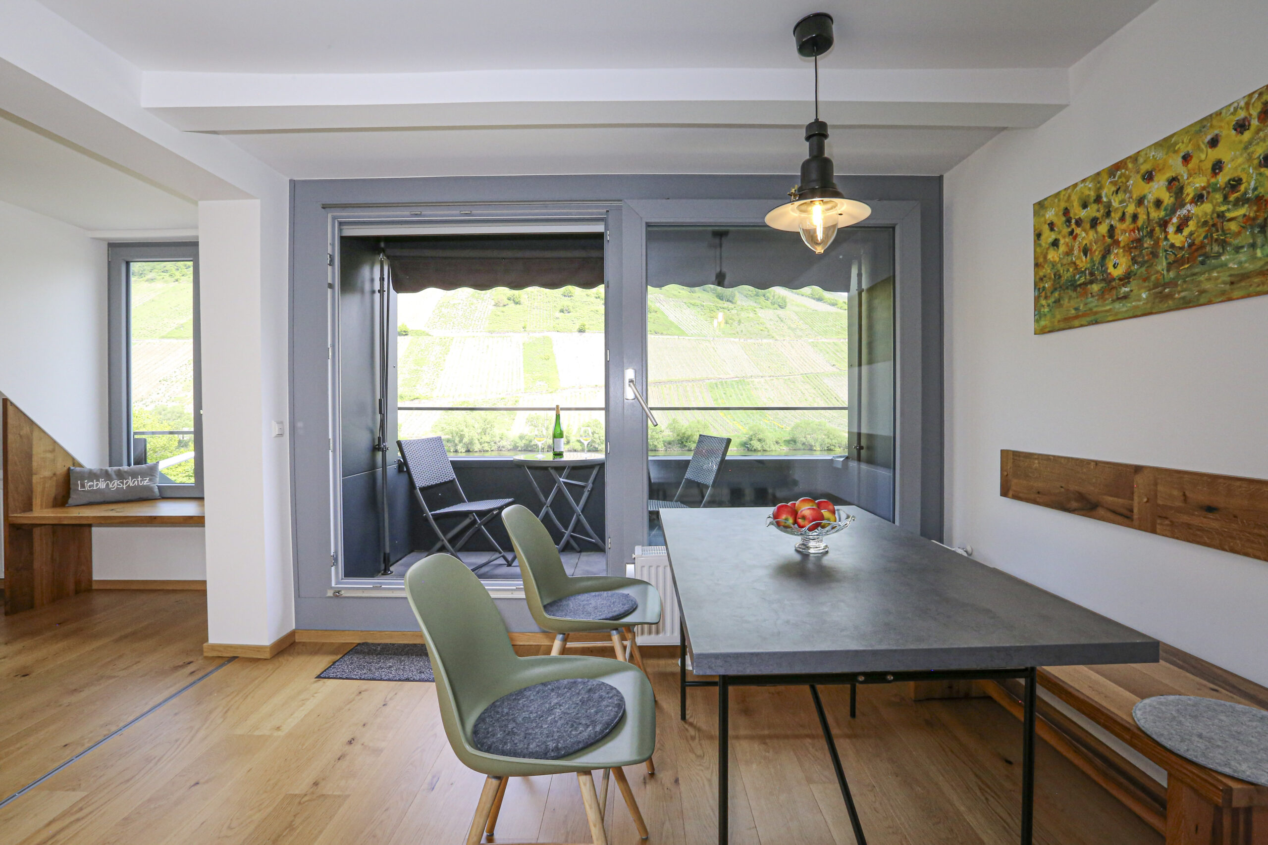 Die Ferienwohnung „Herzchen“ im Dachgeschoss bietet Platz für bis zu 4 Personen und überzeugt mit zwei gemütlichen Schlafzimmern, einem modernen Badezimmer und einer überdachten Loggia mit Blick auf die Mosel und die Weinberge.